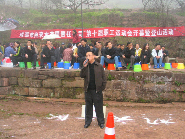 会场主席台上方悬挂着鲜红的会标,操场上彩旗迎风飘扬,各单位登山队员相围而坐,等待参加各项趣味活动。公司总经理李伟和党委书记雷晋川分别讲话,宣布公司第十届职工运动会开幕,同时对全体登山队员所表现出来的顽强拼搏精神给予了表扬。工会主席黄朗宣布了登山活动比赛获奖成绩:荣获第一名的是水五厂代表队,第二名是水二厂代表队,第三名是城西所代表队,第四名是水六厂代表队,第五名是工程公司代表队,第六名是水表厂代表队。