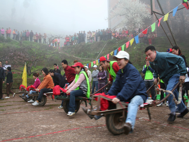 首先由公司领导和现场自愿上场的男女队员进行了一场名为“流星追月”的联欢友谊赛,双方你来我往,击打彩球,竞争激烈,很快使现场气氛热闹起来,既消除了大家登山后的疲惫,又驱散了寒气的侵袭。其后举行的活动有“推鸡公车接力赛”、“各显神通”、“集体跳绳”、“抛绣球”、“采蘑菇”、“滚铁环”、“三个和尚抬水吃”共7个广大职工喜闻乐见的游戏节目,使大家在参与中强身健体,在游戏中陶冶情操,在竞赛中增进友谊。